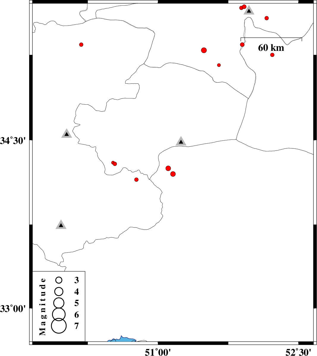 | 2012/08/22 | 06:44:01.7 | 11:14:01.7 | 32.82 | 49.97 | 14 | ML2 | Esfahan Province, 19 km South-West of Fereydunshahr | ||