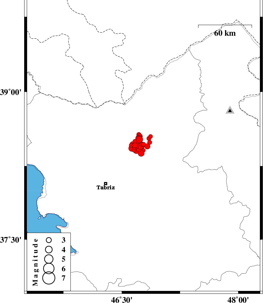| 2012/08/30 | 08:58:47.6 | 13:28:47.6 | 38.55 | 46.87 | 14 | ML2.4 | Azarbaijan Sharghi Province, 20 km West of Ahar | ||