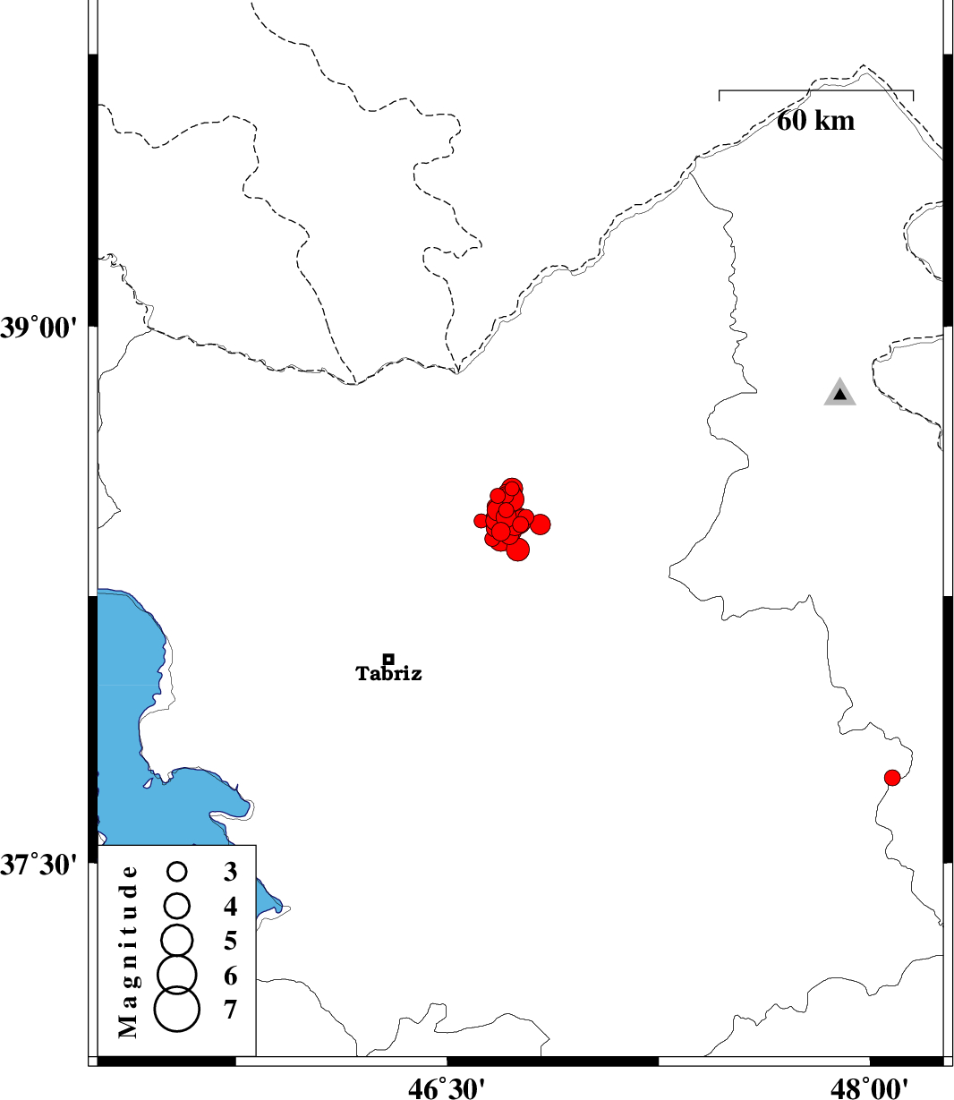 | 2012/09/07 | 19:17:22.0 | 23:47:22.0 | 38.55 | 46.73 | 14 | ML2.3 | Azarbaijan Sharghi Province, 31 km West of Ahar | ||