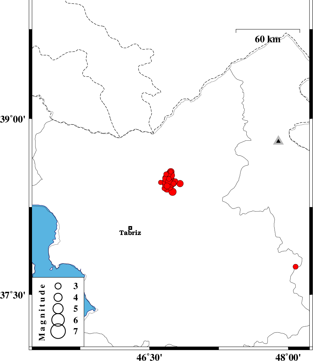 | 2012/09/07 | 19:17:22.0 | 23:47:22.0 | 38.55 | 46.73 | 14 | ML2.3 | Azarbaijan Sharghi Province, 31 km West of Ahar | ||