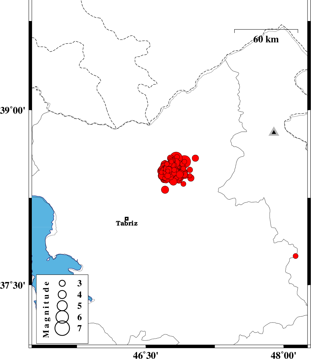 | 2012/08/11 | 12:23:16.2 | 16:53:16.2 | 38.55 | 46.87 | 15 | Mb6.1 | Azarbaijan Sharghi Province, 20 km West of Ahar |