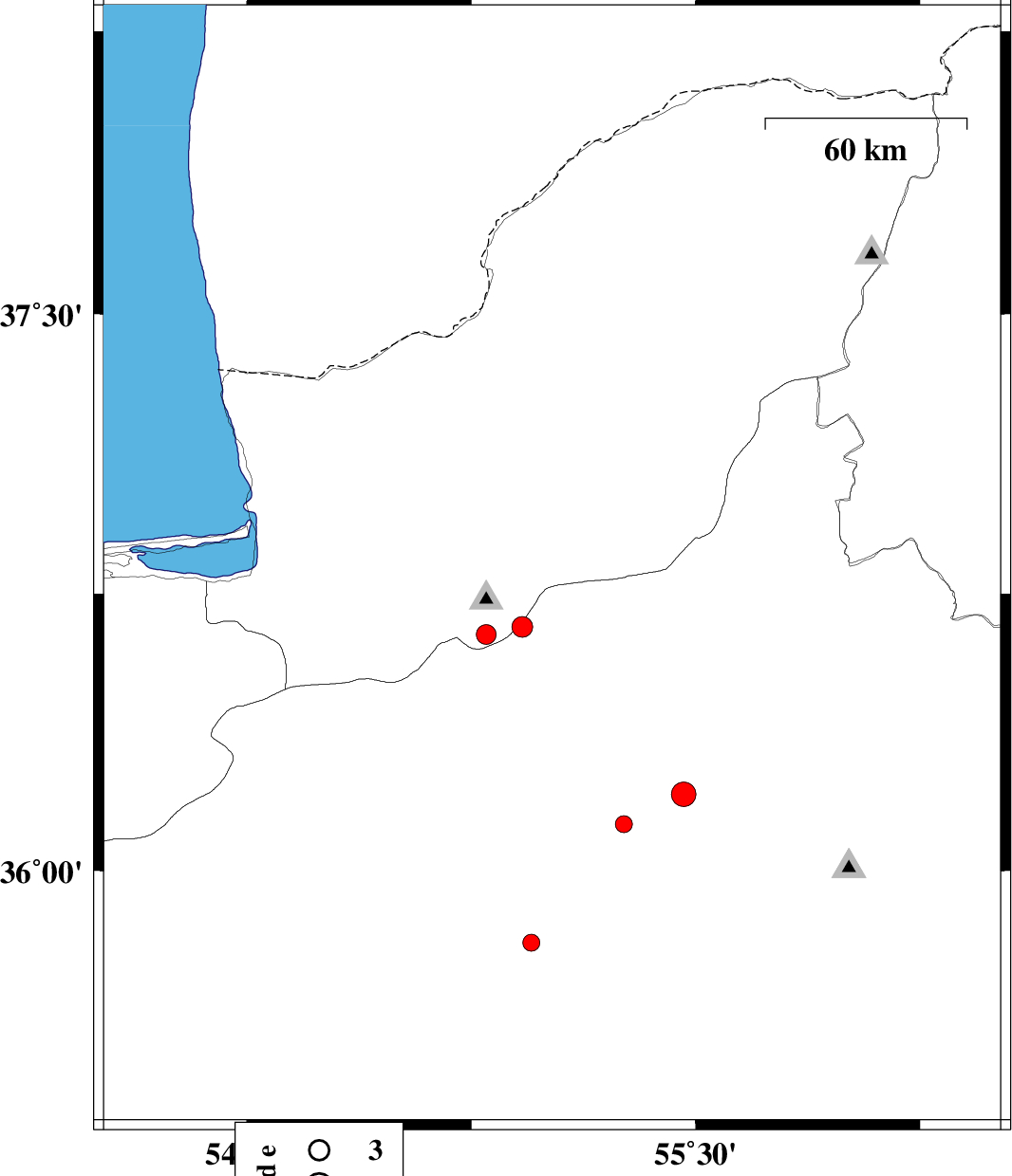 | 2012/08/29 | 23:46:21.5 | 04:16:21.5 | 36.74 | 54.82 | 15 | ML2.5 | Golestan Province, 18 km South of Ali Abad | ||