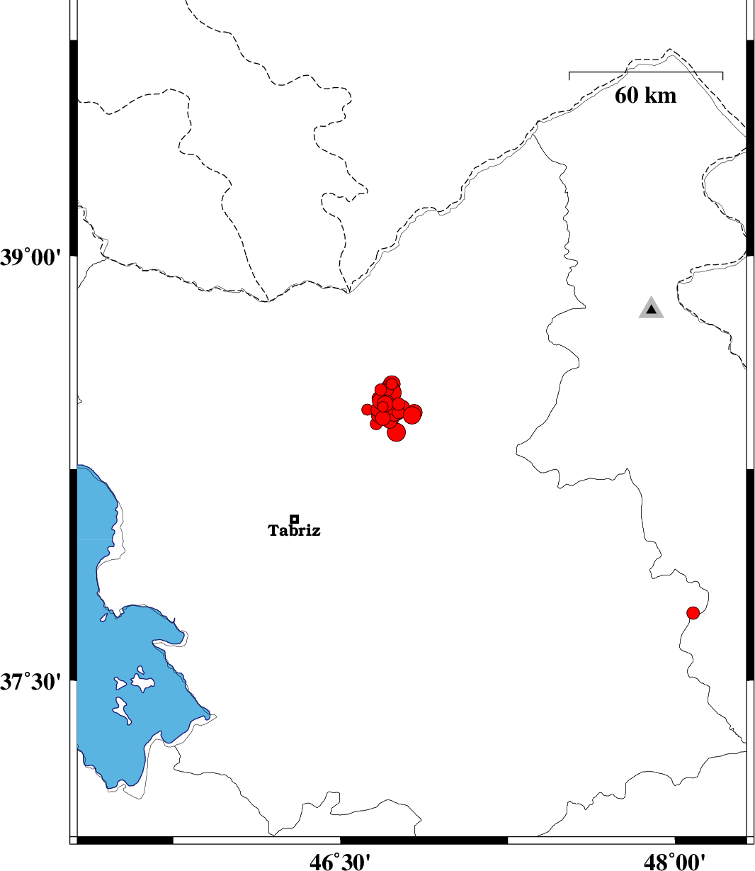 | 2012/09/07 | 19:29:16.3 | 23:59:16.3 | 38.53 | 46.68 | 14 | ML2.4 | Azarbaijan Sharghi Province, 35 km West of Ahar | ||