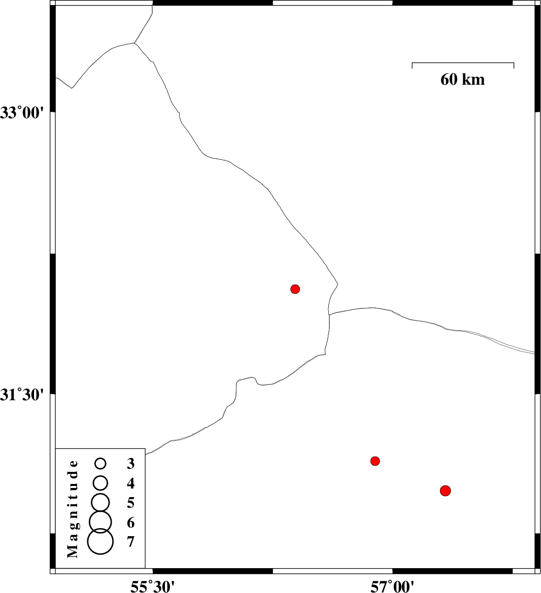 | 2012/09/08 | 06:04:59.4 | 10:34:59.4 | 30.98 | 57.33 | 18 | ML2.9 | Kerman Province, 59 km South-East of Ravar |