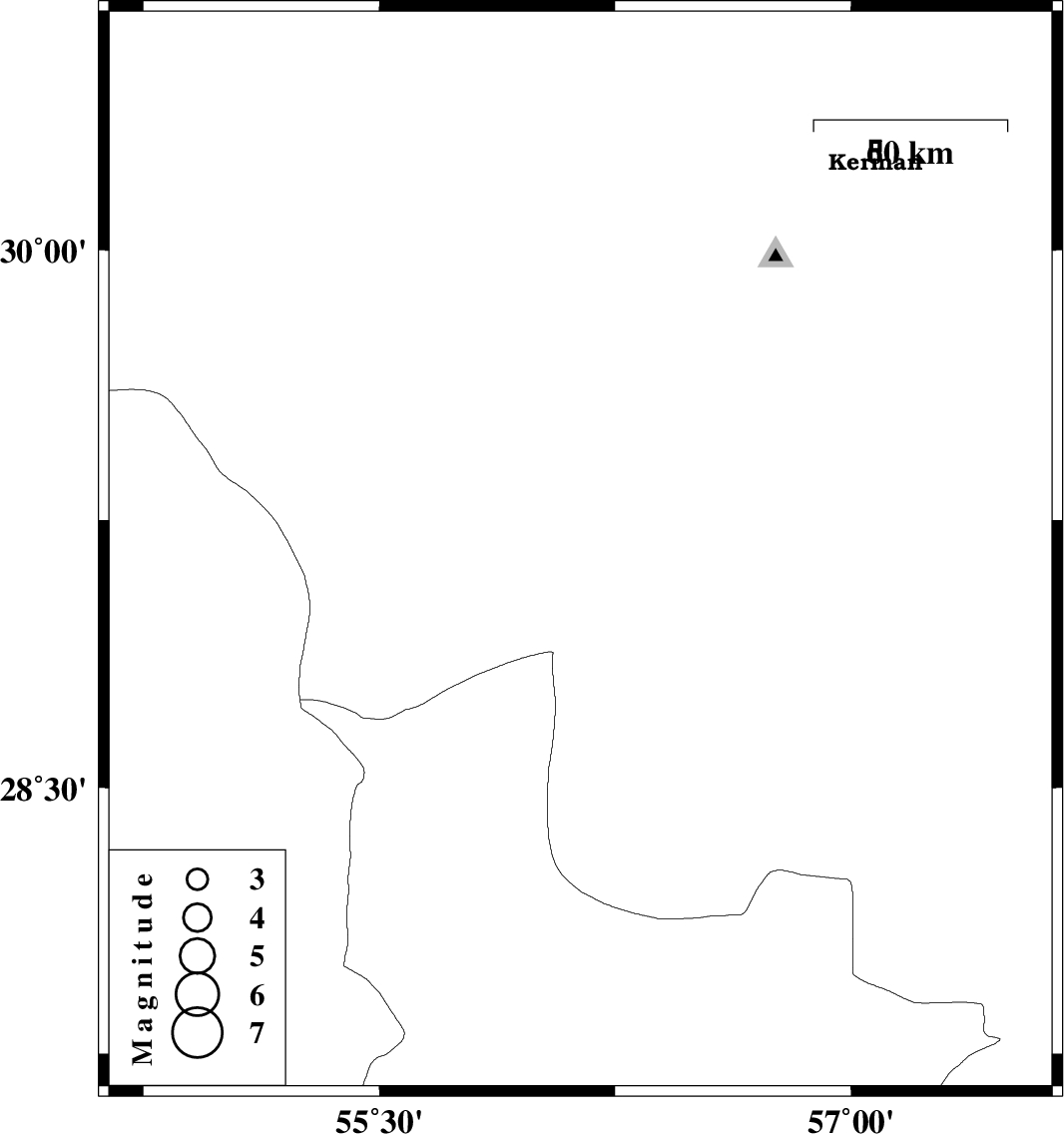 | 2012/09/15 | 19:05:18.4 | 23:35:18.4 | 29.16 | 56.14 | 14 | ML3.4 | Kerman Province, 47 km West of Baft |