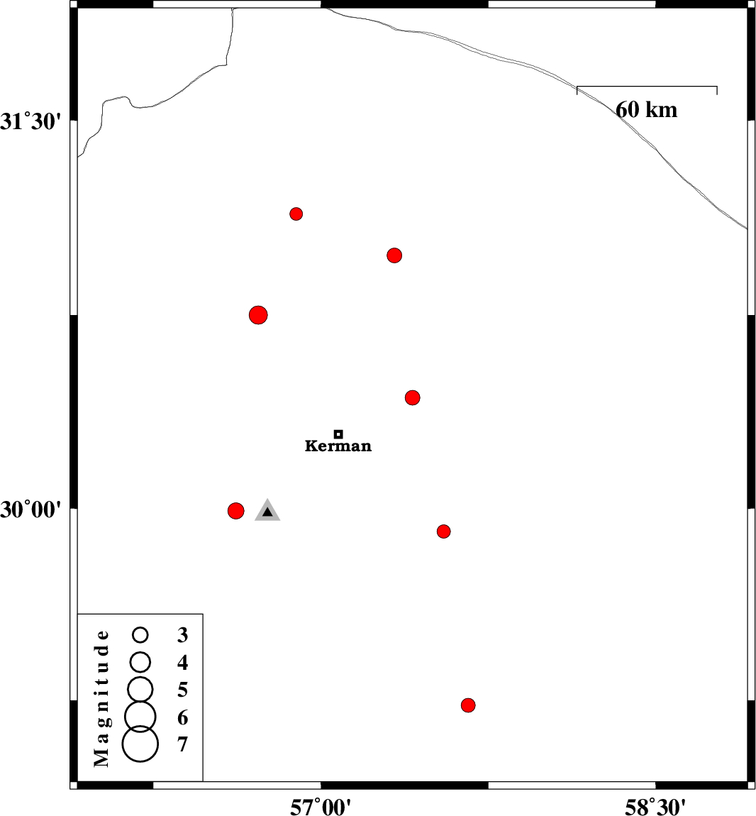 | 2012/09/16 | 15:26:34.9 | 19:56:34.9 | 29.99 | 56.62 | 14 | ML3.2 | Kerman Province, 9 km Bardsir | ||