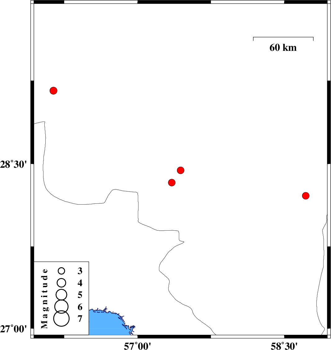 | 2012/09/21 | 09:03:42.6 | 12:33:42.6 | 28.44 | 57.44 | 14 | ML3.2 | Kerman Province, 39 km South-West of Jiroft | ||