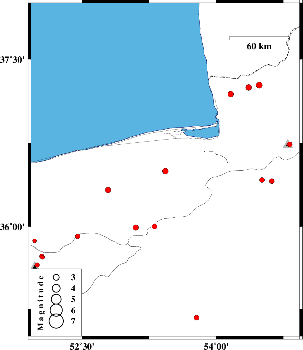 | 2012/09/23 | 01:04:50.1 | 04:34:50.1 | 36.5 | 53.43 | 14 | ML2.9 | Mazandaran Province, 20 km South-East of Neka | ||