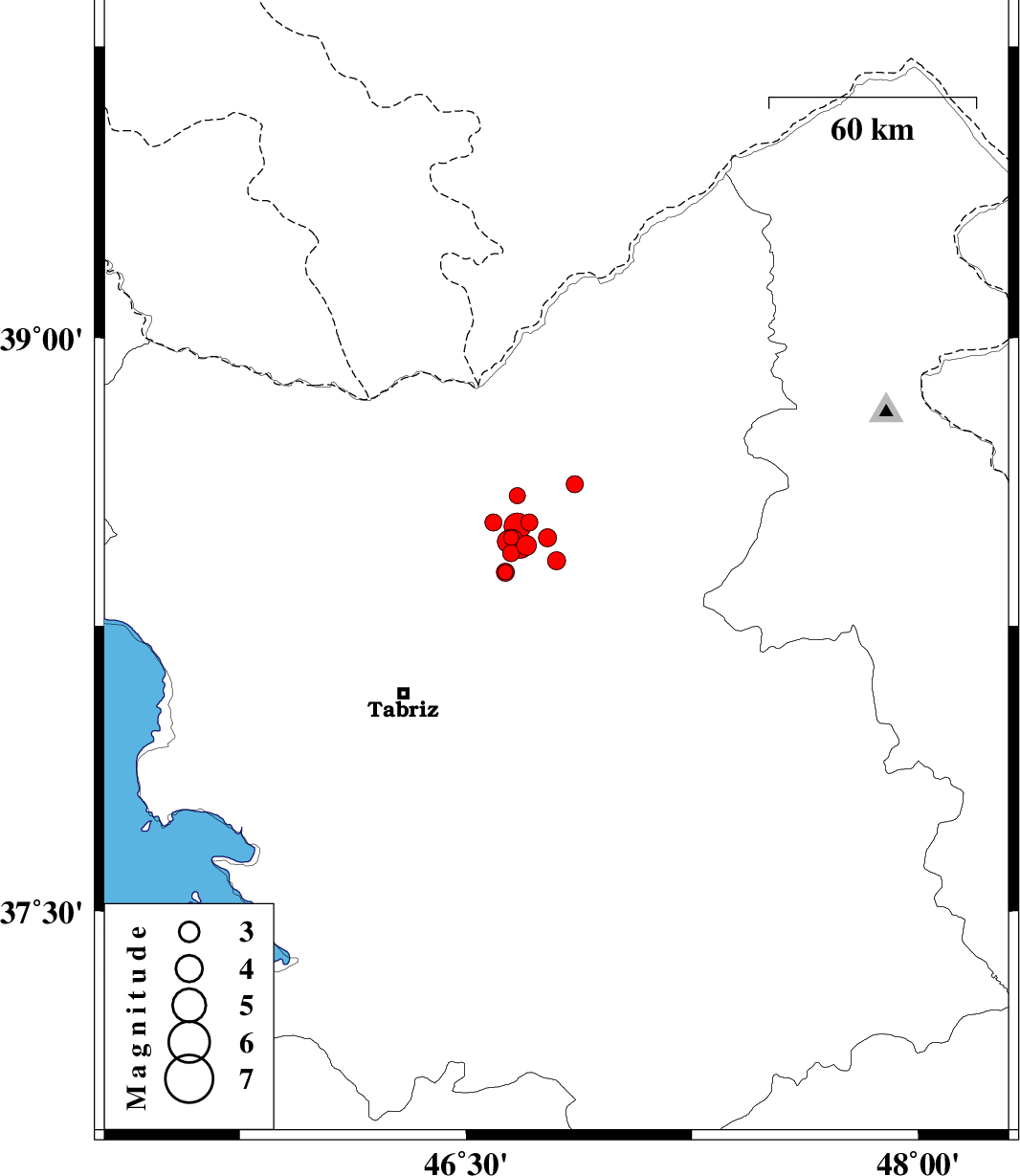 | 2012/09/19 | 10:11:00.5 | 14:41:00.5 | 38.62 | 46.86 | 15 | ML2.6 | Azarbaijan Sharghi Province, 25 km North-West of Ahar |