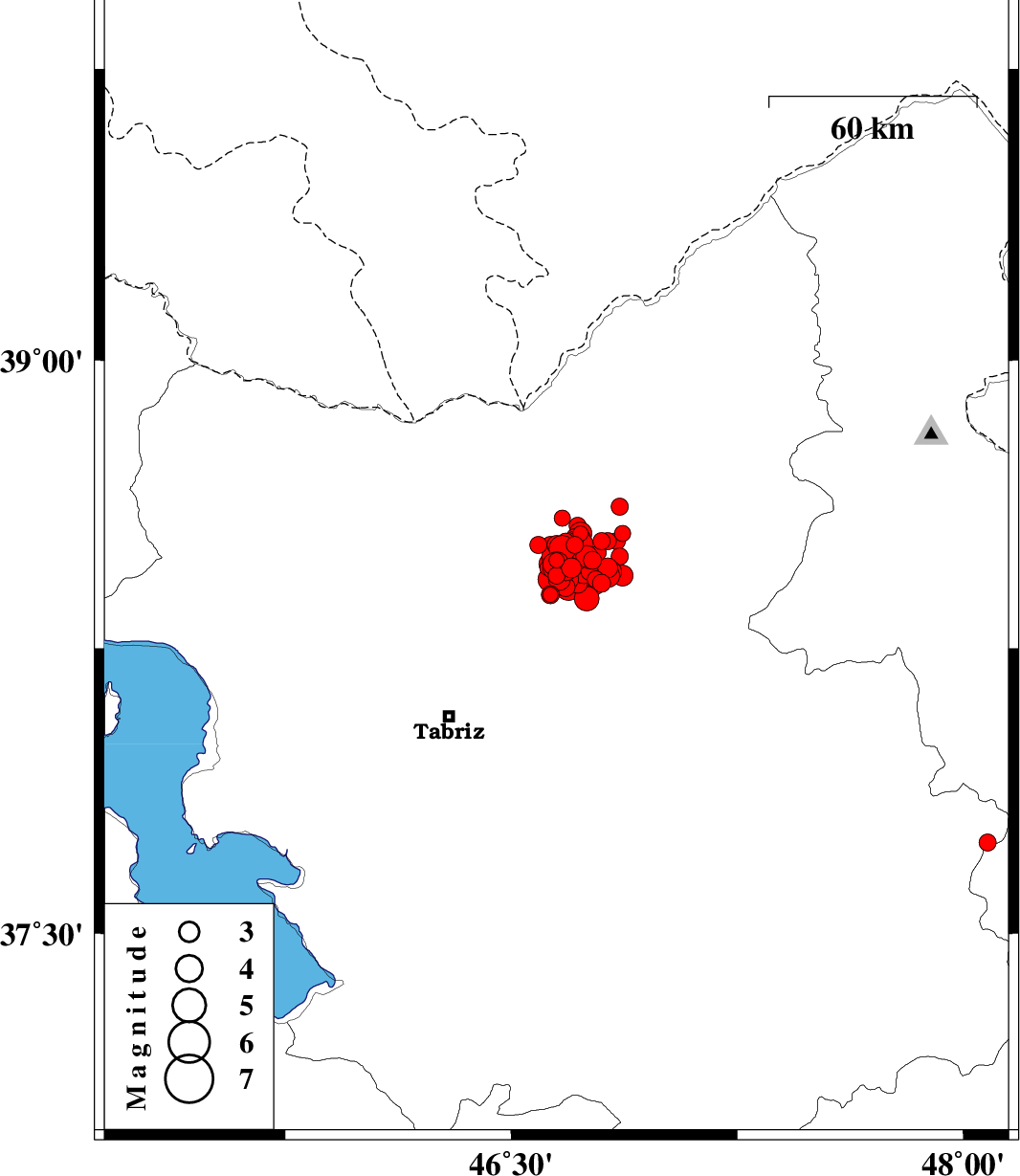 | 2012/08/30 | 06:25:51.1 | 10:55:51.1 | 38.47 | 46.69 | 18 | ML2.5 | Azarbaijan Sharghi Province, 34 km West of Ahar | ||
