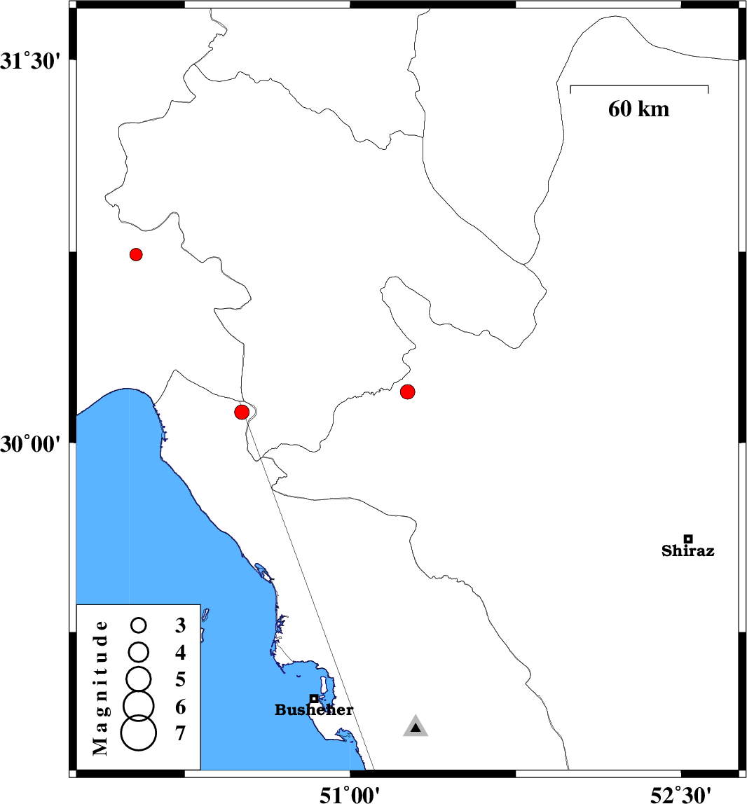 | 2012/09/26 | 22:58:34.8 | 02:28:34.8 | 30.2 | 51.26 | 46 | ML3 | Fars Province, 27 km West of Nurabad | ||