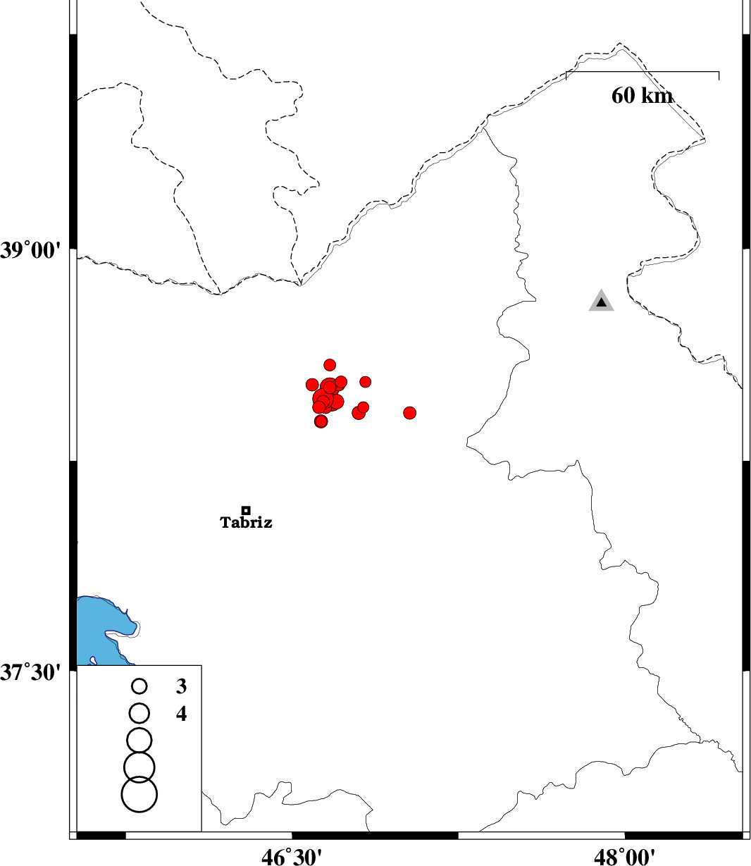 | 2012/09/27 | 00:56:01.8 | 04:26:01.8 | 38.47 | 46.64 | 18 | ML4.3 | Azarbaijan Sharghi Province, 38 km West of Ahar | ||