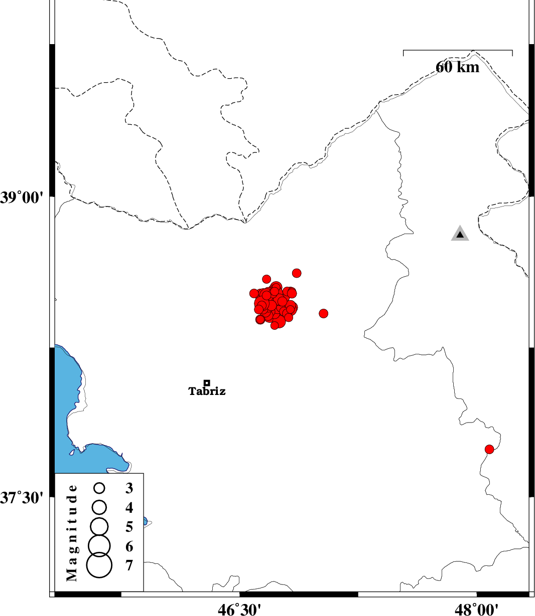 | 2012/09/26 | 03:06:33.4 | 06:36:33.4 | 38.46 | 46.7 | 17 | ML2.9 | Azarbaijan Sharghi Province, 34 km West of Ahar | ||