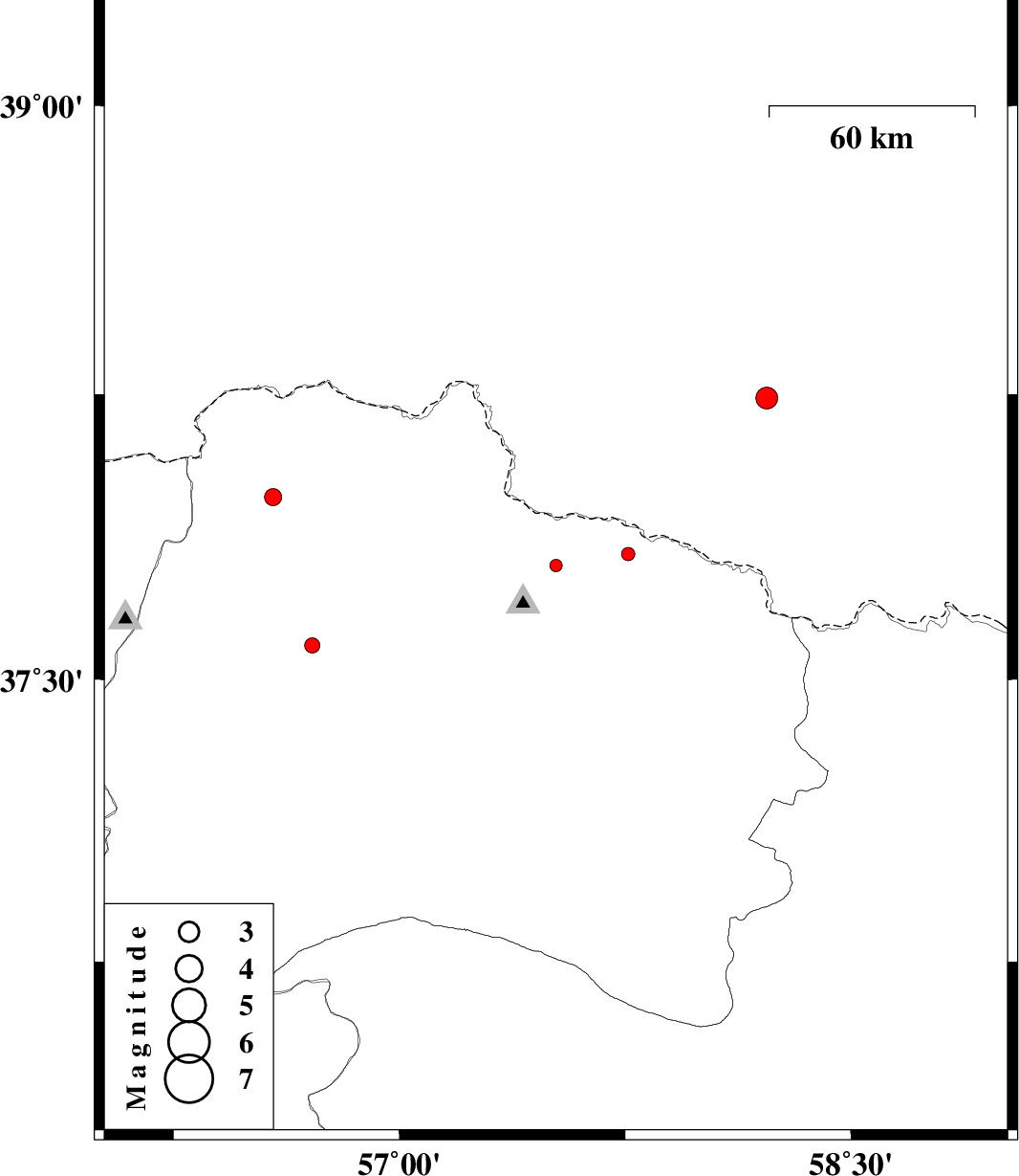 | 2012/10/01 | 00:39:17.6 | 04:09:17.6 | 37.8 | 57.52 | 14 | ML1.9 | Khorasan(north) Province, 40 km North-East of Bojnurd | ||