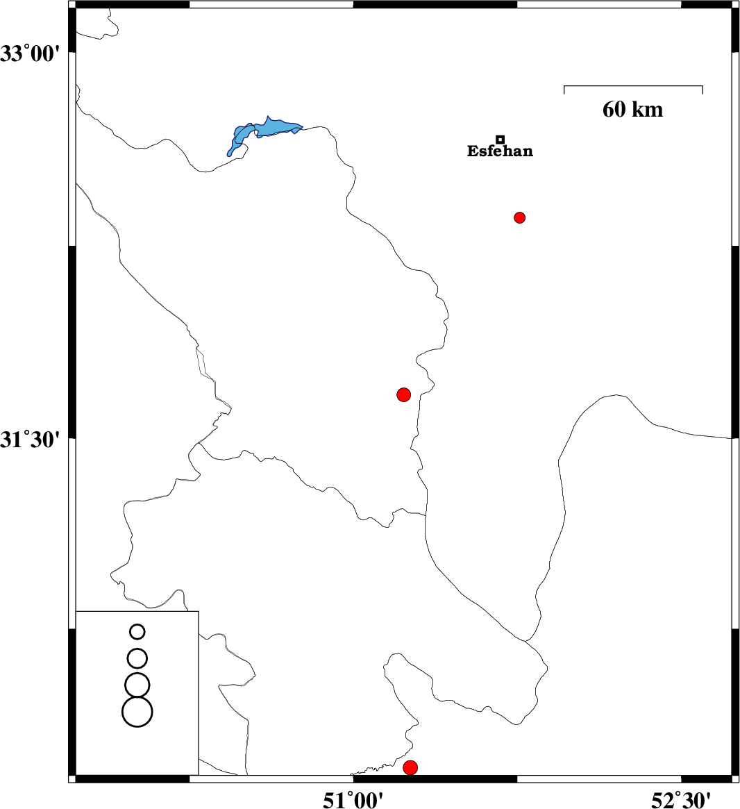 | 2012/09/26 | 22:58:34.8 | 02:28:34.8 | 30.2 | 51.26 | 46 | ML3 | Fars Province, 27 km West of Nurabad |