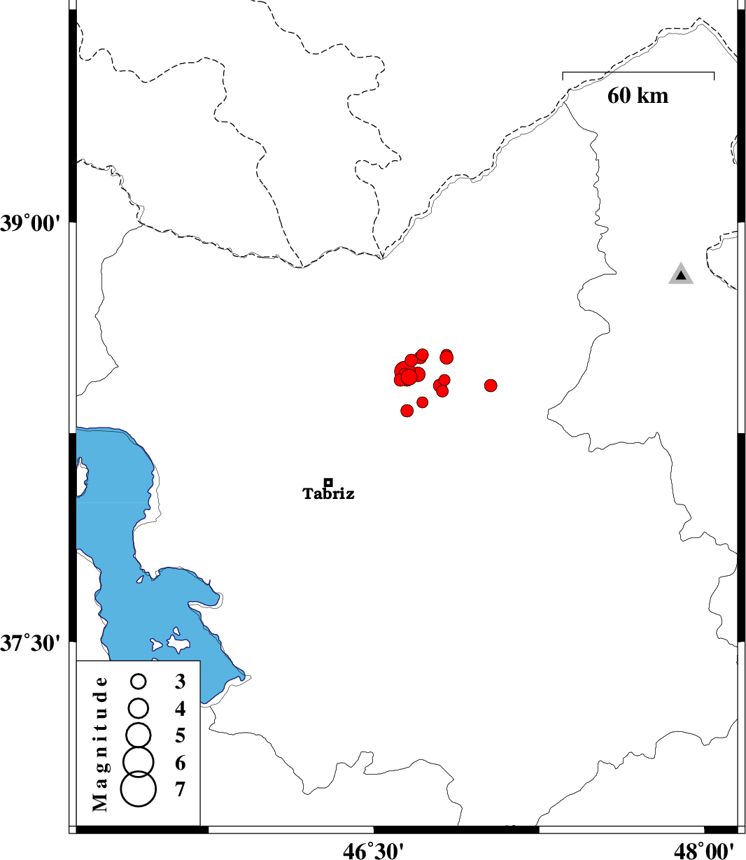 | 2012/10/01 | 16:22:27.6 | 19:52:27.6 | 38.45 | 46.66 | 14 | ML3.3 | Azarbaijan Sharghi Province, 36 km West of Ahar | ||