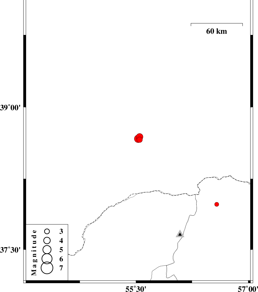 | 2012/10/01 | 15:43:37.3 | 19:13:37.3 | 37.98 | 56.58 | 14 | ML2.6 | Khorasan(north) Province, 58 km North-West of Ashkhaneh | ||