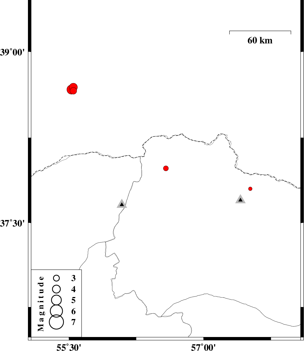 | 2012/10/01 | 00:39:17.6 | 04:09:17.6 | 37.8 | 57.52 | 14 | ML1.9 | Khorasan(north) Province, 40 km North-East of Bojnurd |
