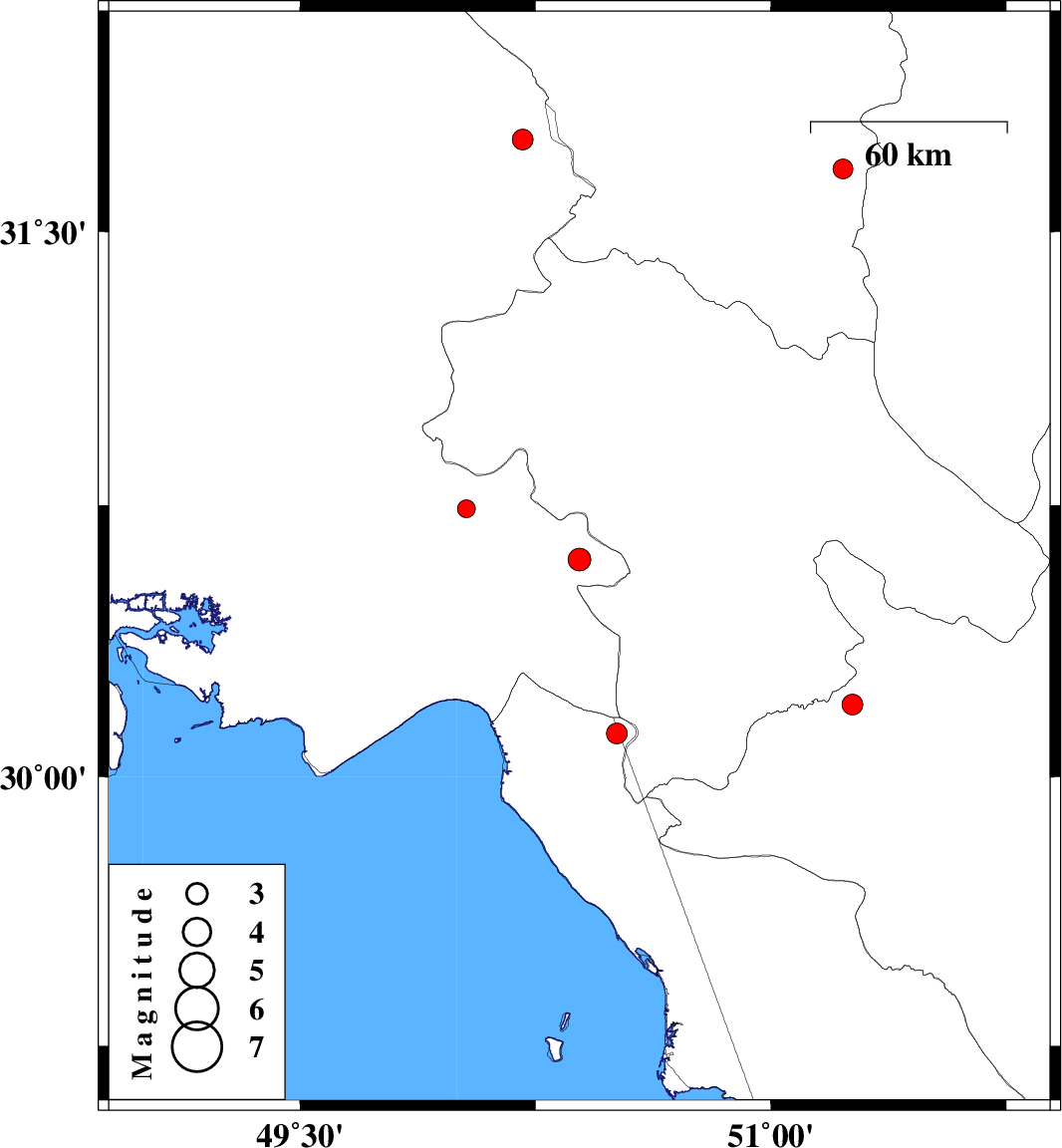 | 2012/09/09 | 20:23:14.5 | 00:53:14.5 | 30.12 | 50.51 | 14 | ML3 | Khoozestan Province, 37 km South-West of Dogonbadan | ||
