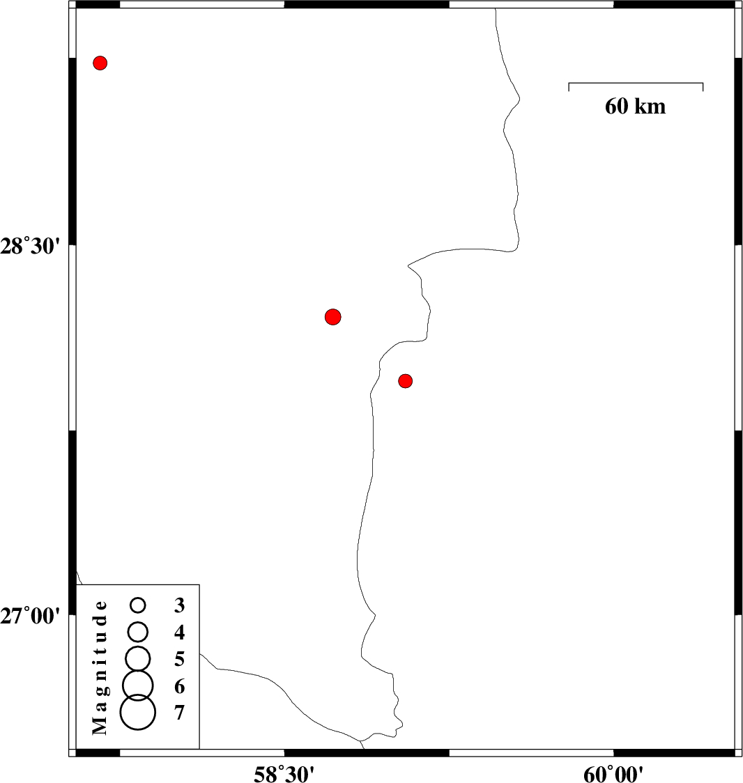 | 2012/09/19 | 22:09:12.6 | 02:39:12.6 | 28.21 | 58.72 | 18 | ML3.2 | Kerman Province, 106 km South-East of Bam | ||