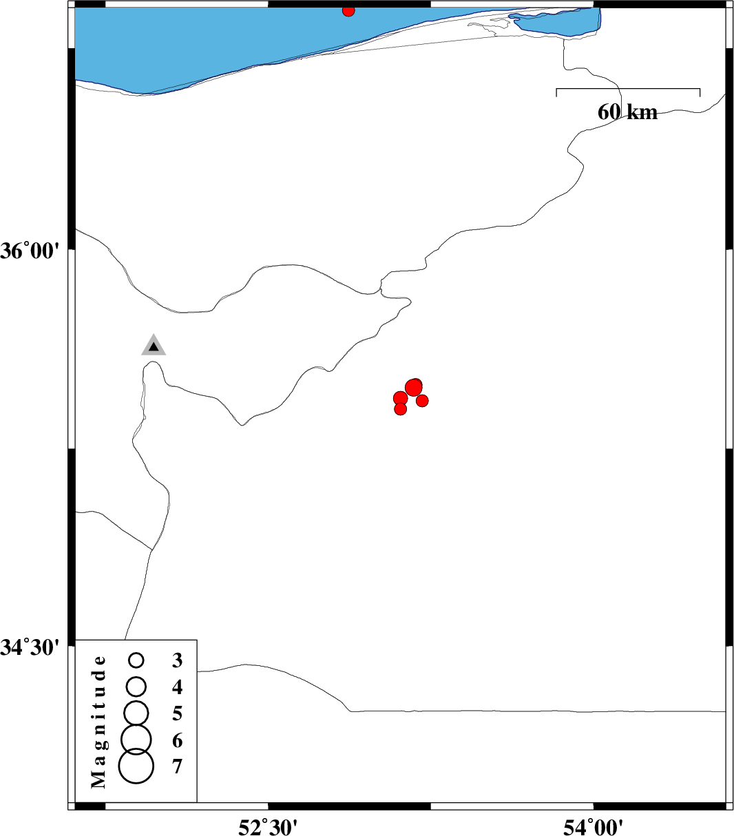 | 2012/10/07 | 21:10:17.3 | 00:40:17.3 | 35.44 | 53.11 | 15 | ML3 | Semnan Province, 29 km South-West of Semnan | ||