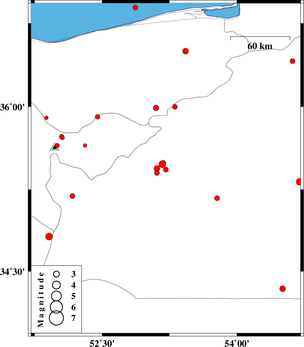 | 2012/09/12 | 21:17:46.2 | 01:47:46.2 | 35.19 | 52.17 | 16 | ML2.5 | Semnan Province, 16 km West of Garmsar | ||