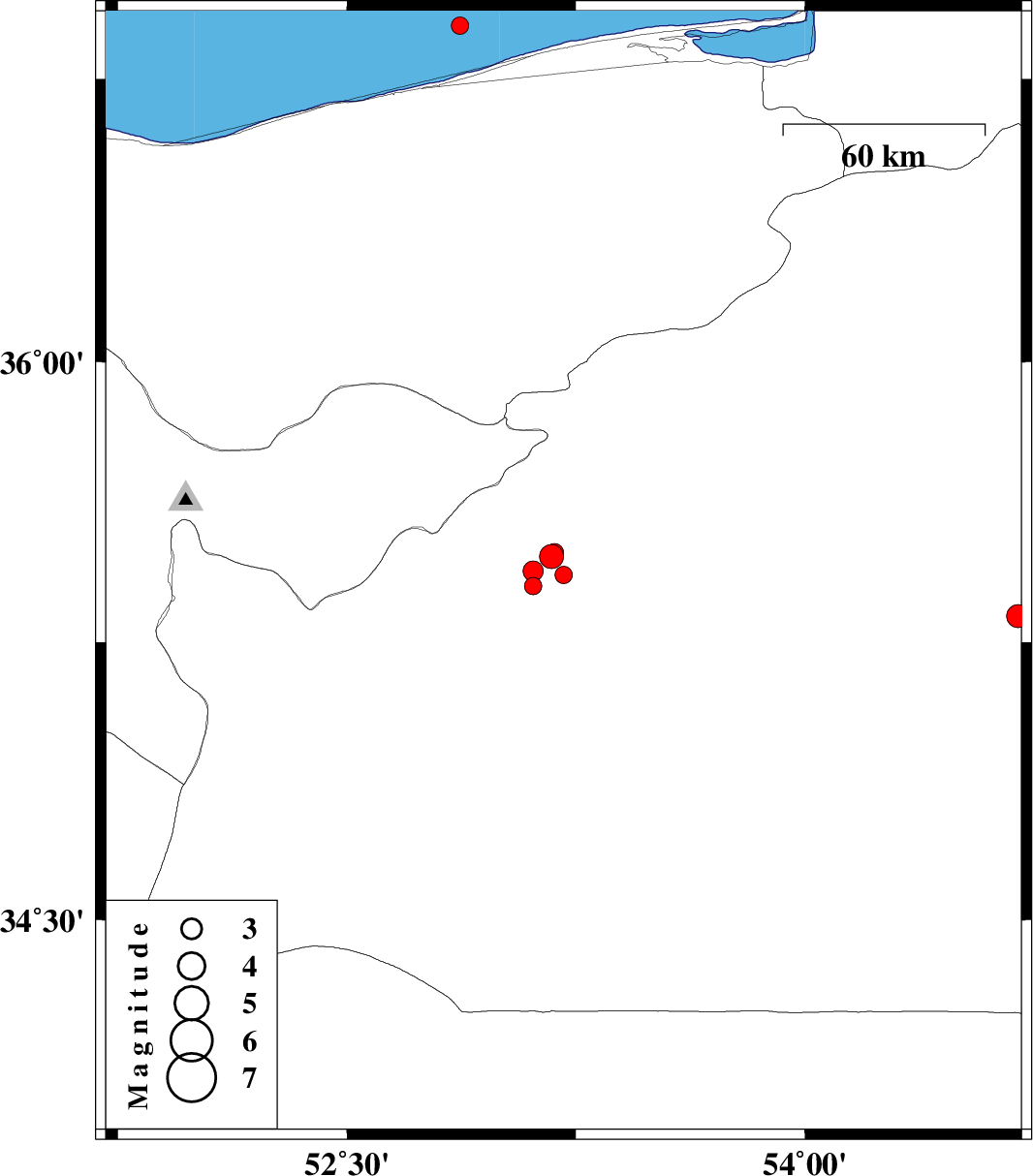 | 2012/10/07 | 16:01:23.9 | 19:31:23.9 | 36.89 | 52.87 | 14 | ML2.5 | Caspian Sea, 29 km North of Joybar |