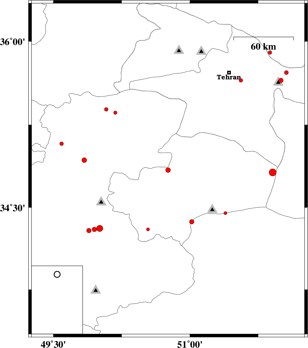 | 2012/09/25 | 08:15:04.2 | 11:45:04.2 | 34.82 | 51.91 | 14 | ML3.5 | Qom Province, 60 km South-East of Varamin | ||