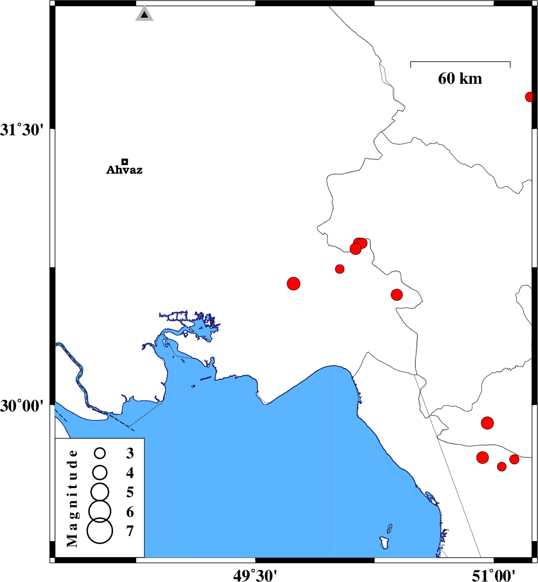 | 2012/10/14 | 07:46:45.8 | 11:16:45.8 | 30.88 | 50.17 | 14 | ML3 | Kohkiluieh va boyerahmad Province, 32 km North of Behbahan | ||