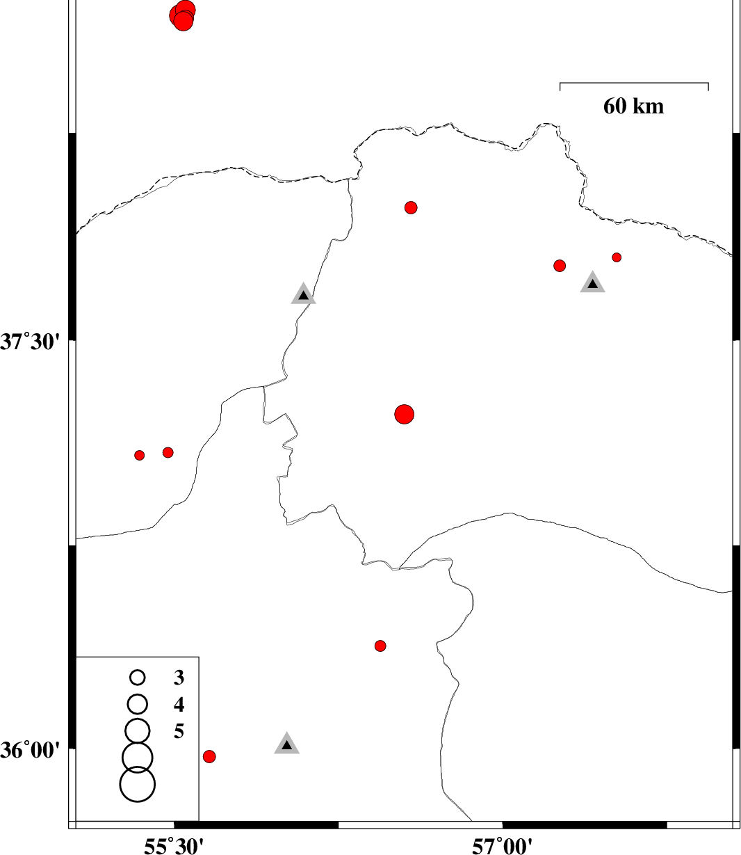 | 2012/10/13 | 12:42:05.3 | 16:12:05.3 | 37.08 | 55.34 | 43 | ML2 | Golestan Province, 15 km East of Azadshahr | ||