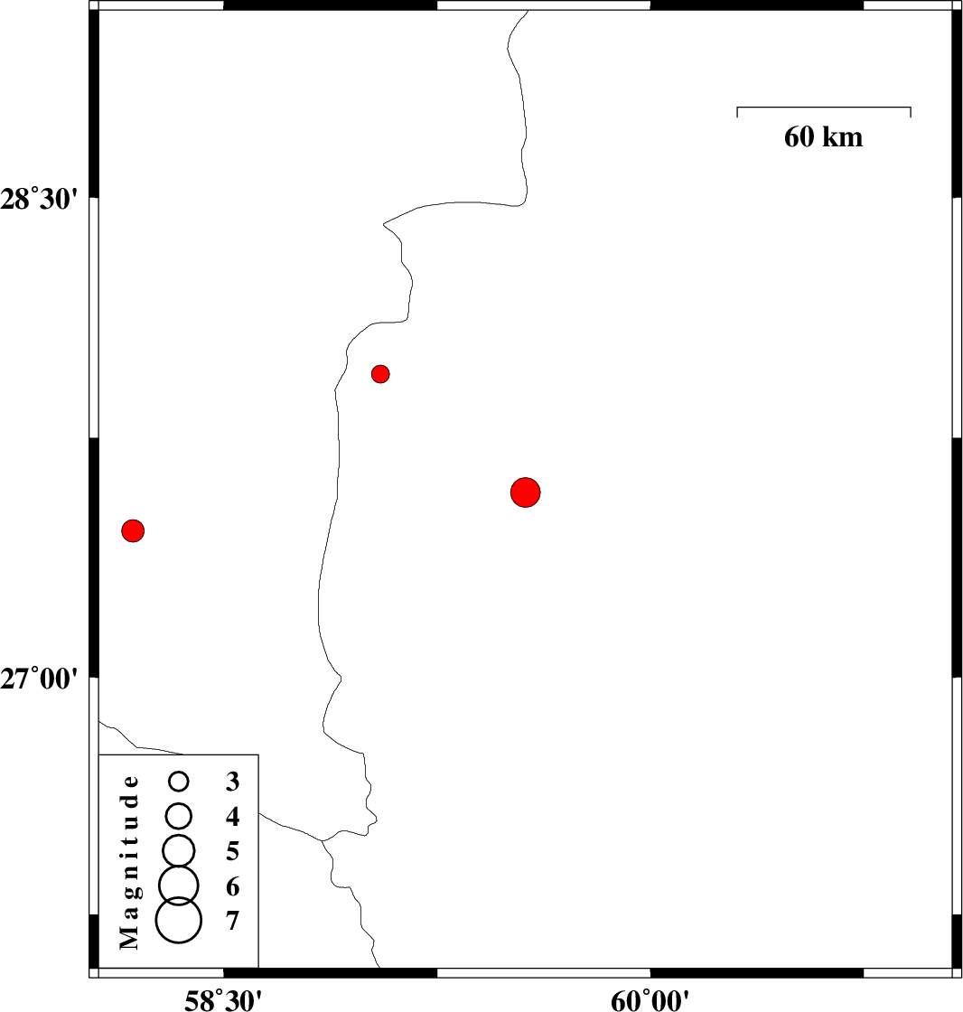 | 2012/10/16 | 23:43:53.5 | 03:13:53.5 | 27.46 | 58.18 | 14 | ML3.5 | Kerman Province, 67 km East of Manujan | ||