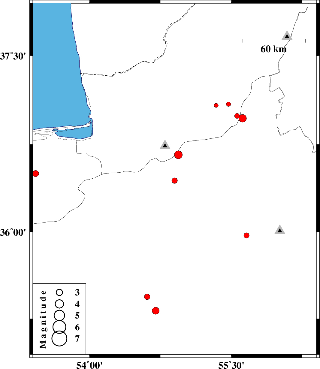 | 2012/10/21 | 19:07:50.1 | 22:37:50.1 | 36.97 | 55.62 | 6 | ML3.7 | Semnan Province, 36 km South-East of Minodasht | ||