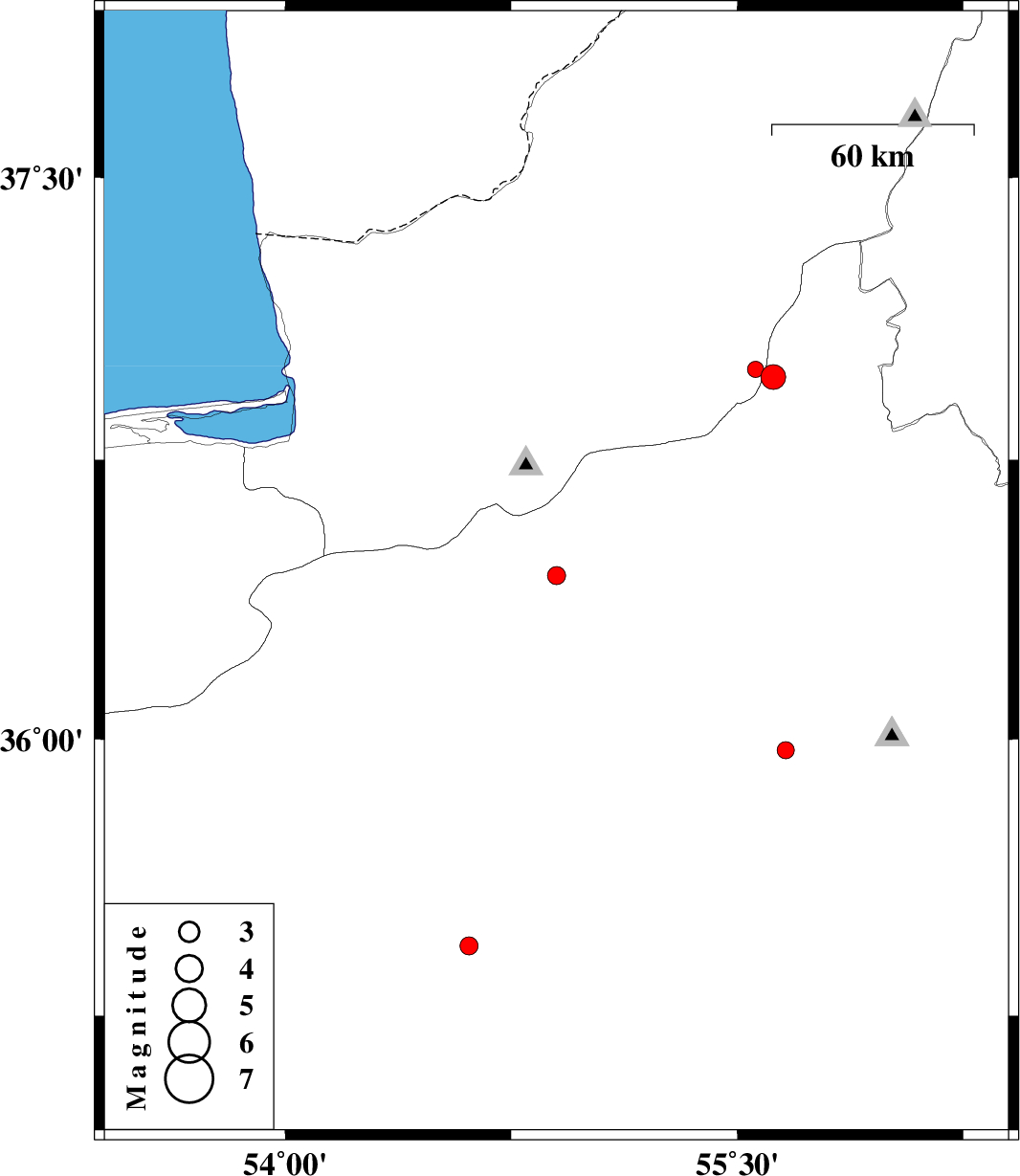 | 2012/10/16 | 00:15:36.2 | 03:45:36.2 | 35.97 | 55.66 | 6 | ML2.6 | Semnan Province, 79 km South-East of Shahrud |