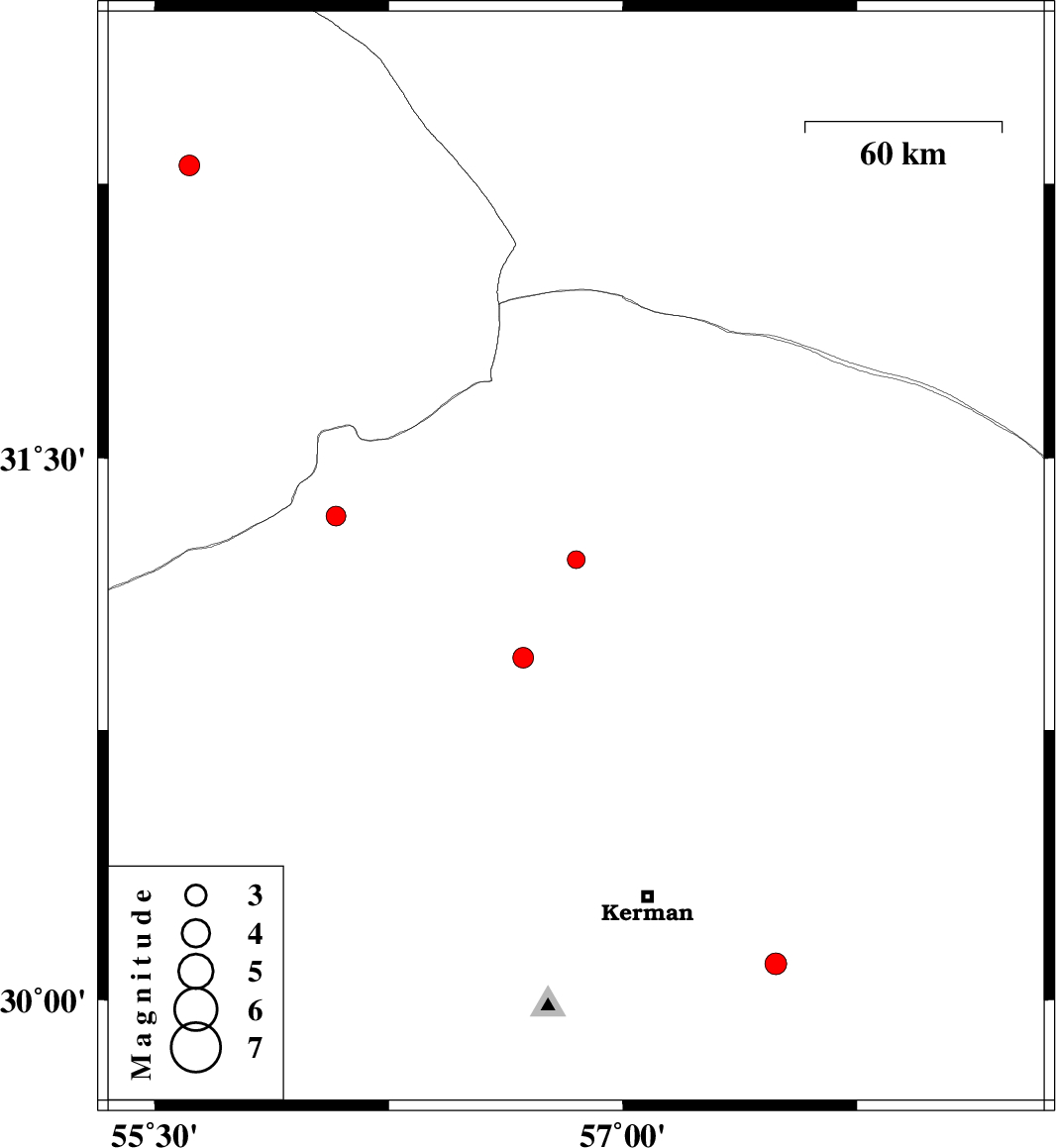 | 2012/09/26 | 09:49:43.3 | 13:19:43.3 | 31.34 | 56.08 | 46 | ML2.8 | Kerman Province, 70 km West of Ravar |