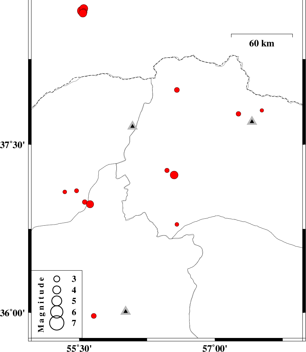 | 2012/10/19 | 04:43:08.3 | 08:13:08.3 | 37.23 | 56.55 | 14 | ML4 | Khorasan(north) Province, 34 km North-East of Jajarm | ||