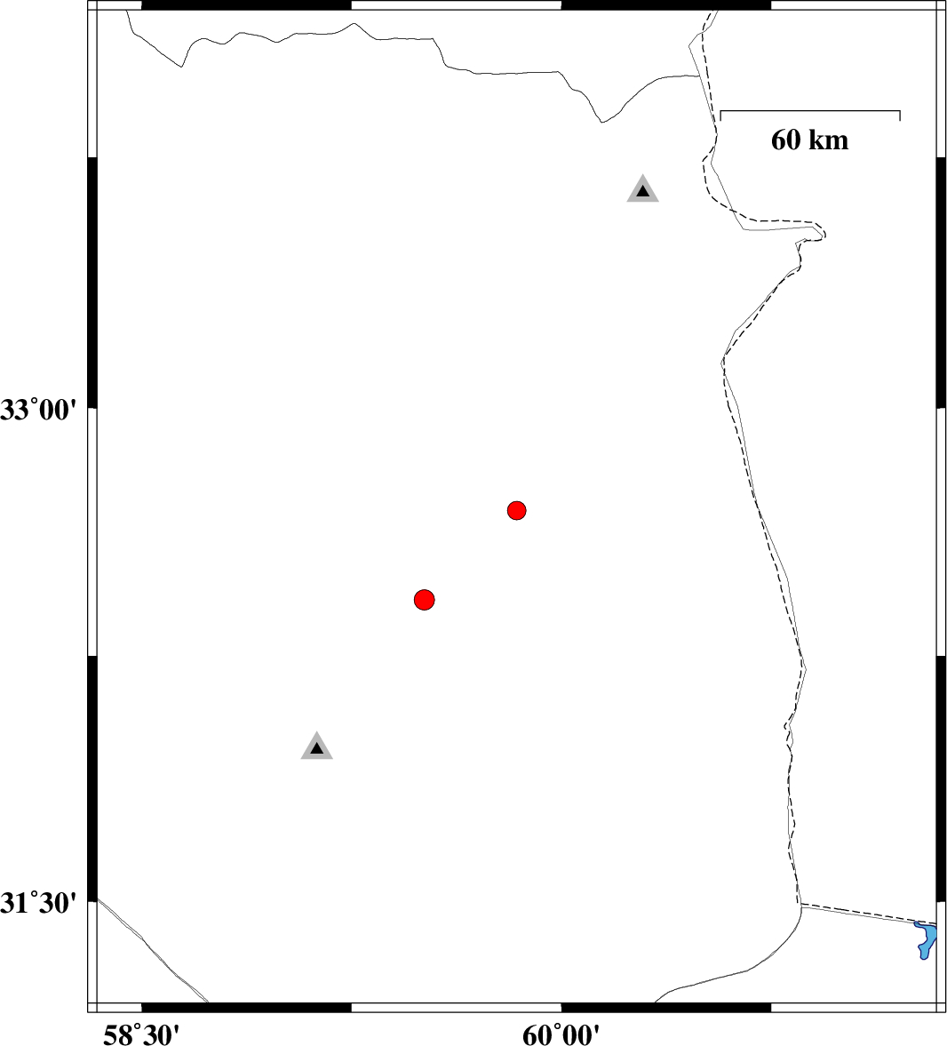 | 2012/10/30 | 19:18:29.7 | 22:48:29.7 | 32.69 | 59.84 | 42 | ML2.9 | Khorasan(south) Province, 9 km Sarbisheh | ||