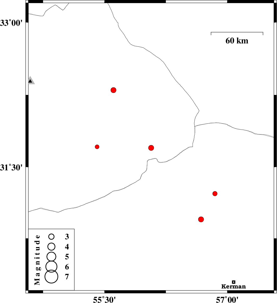 | 2012/10/05 | 03:16:23.1 | 06:46:23.1 | 30.95 | 56.68 | 15 | ML3 | Kerman Province, 19 km North-East of Zarand |