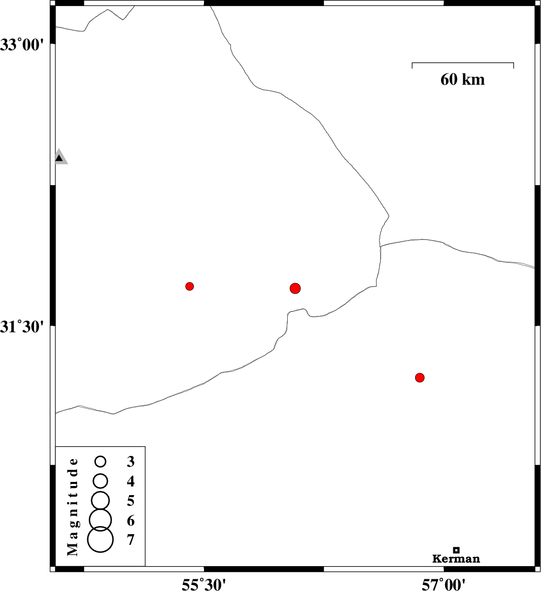 | 2012/10/26 | 00:02:34.3 | 03:32:34.3 | 31.22 | 56.85 | 14 | ML2.6 | Kerman Province, 6 km Ravar |