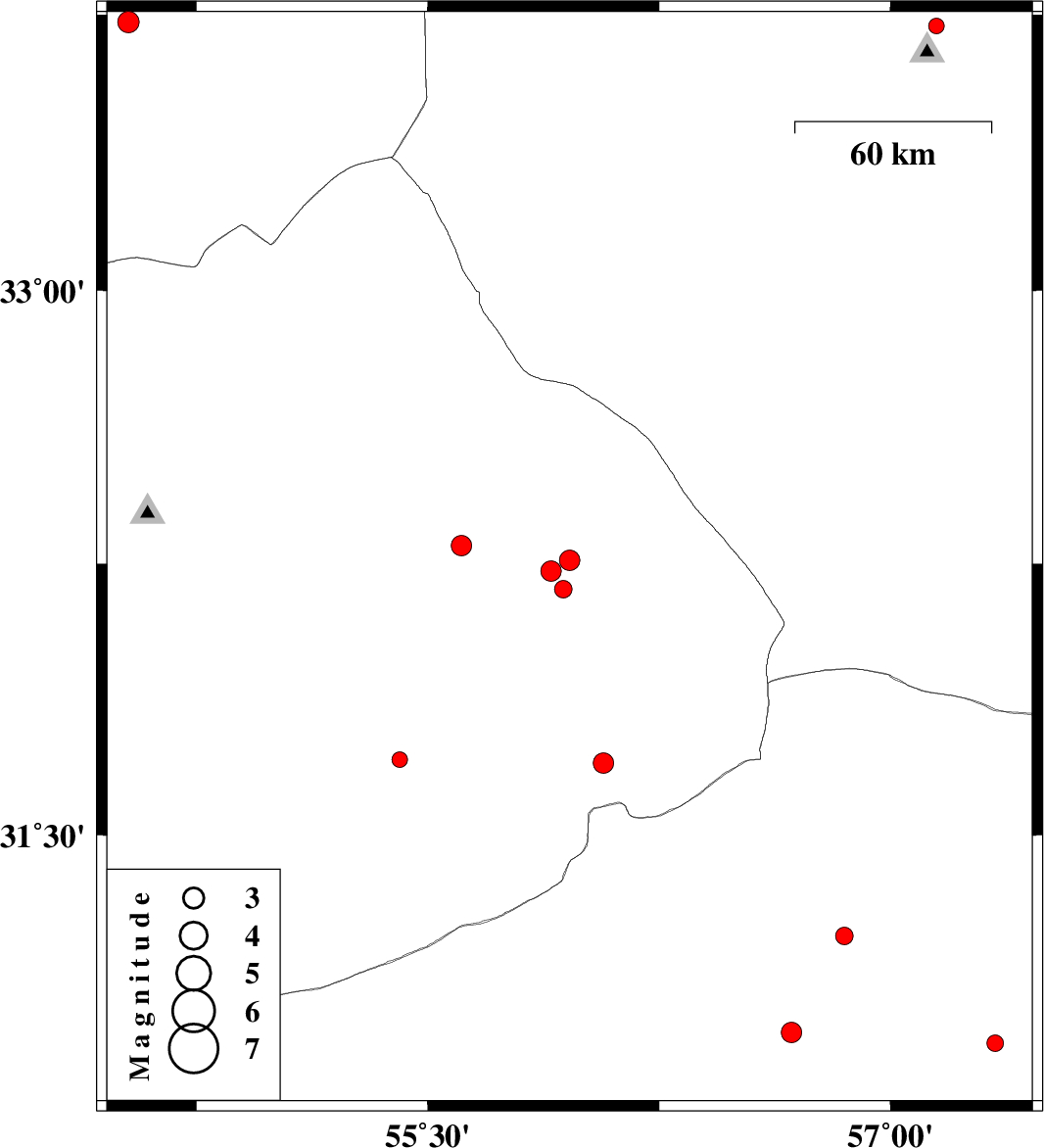 | 2012/10/19 | 04:28:15.9 | 07:58:15.9 | 33.72 | 57.15 | 14 | ML2.3 | Yazd Province, 25 km North-East of Tabas | ||