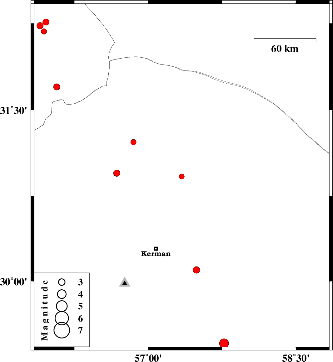 | 2012/10/06 | 00:16:14.9 | 03:46:14.9 | 30.1 | 57.49 | 15 | ML3.1 | Kerman Province, 45 km South-East of Kerman | ||