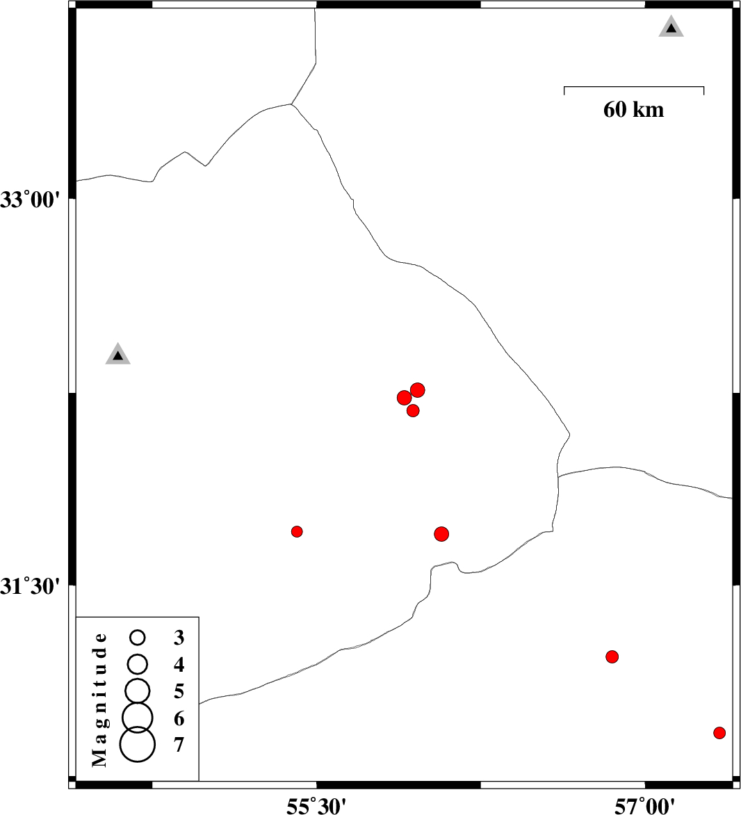 | 2012/10/26 | 00:02:34.3 | 03:32:34.3 | 31.22 | 56.85 | 14 | ML2.6 | Kerman Province, 6 km Ravar |