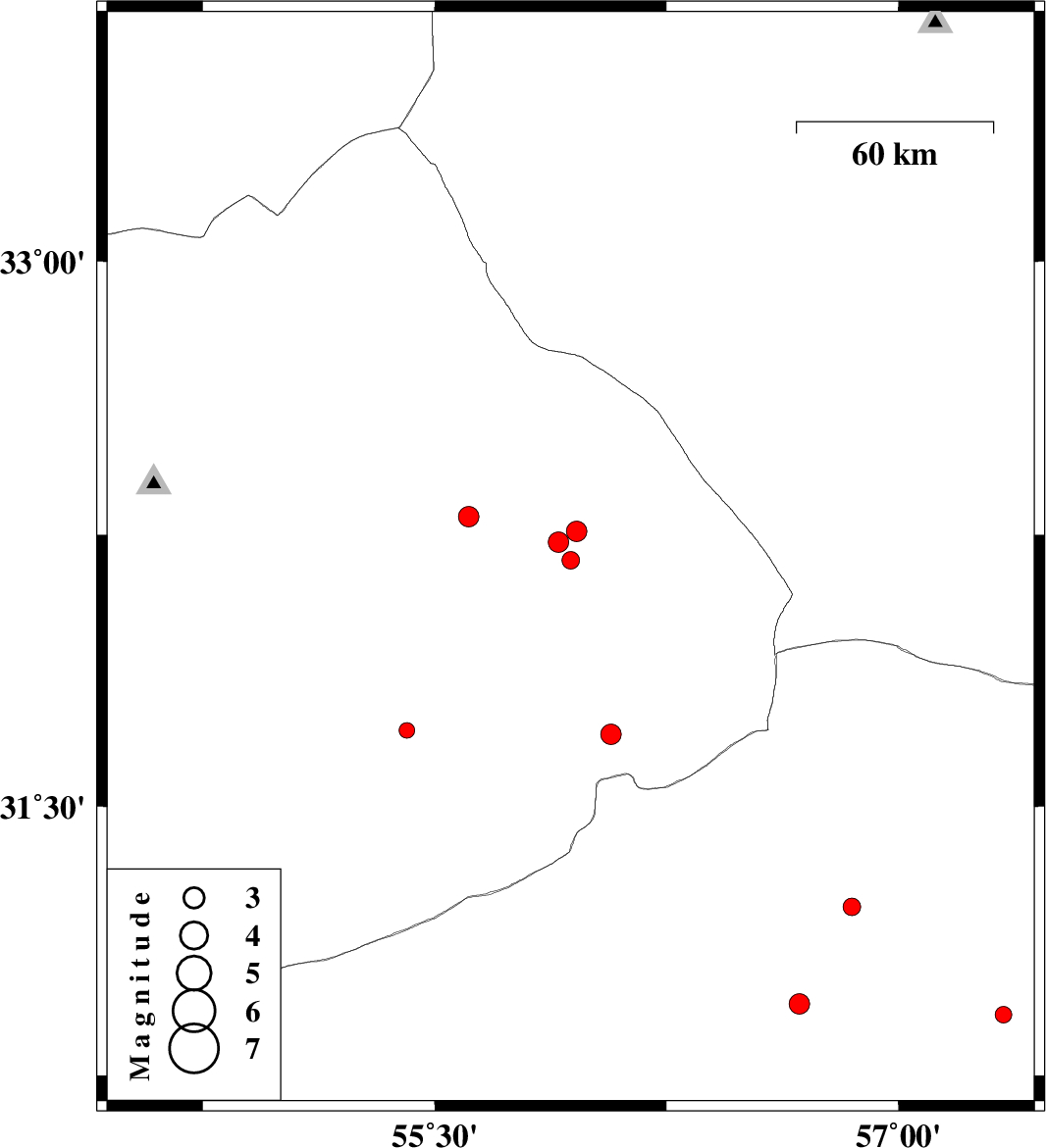 | 2012/10/05 | 03:16:23.1 | 06:46:23.1 | 30.95 | 56.68 | 15 | ML3 | Kerman Province, 19 km North-East of Zarand |