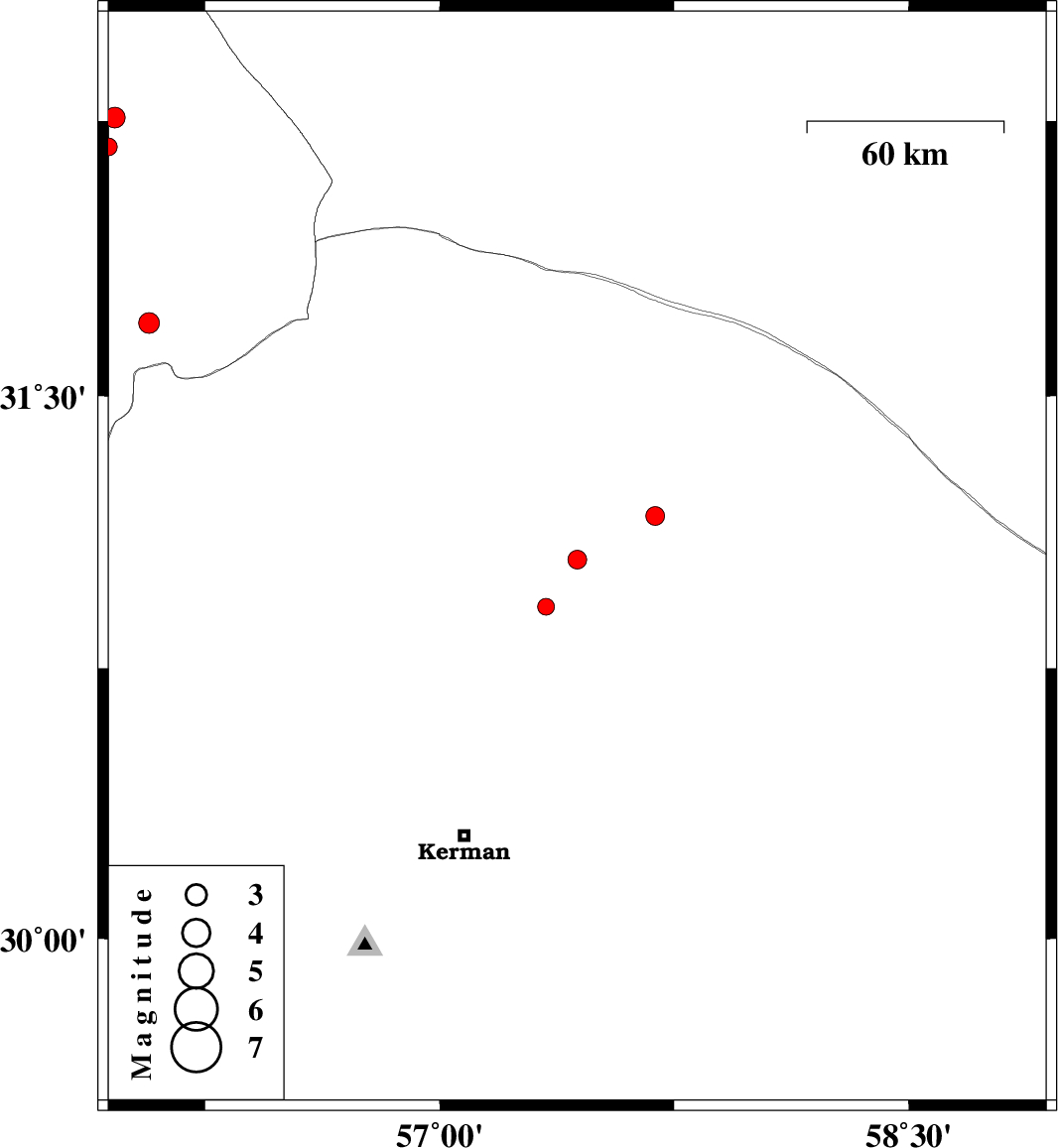 | 2012/11/02 | 07:34:40.8 | 11:04:40.8 | 31.17 | 57.69 | 14 | ML2.7 | Kerman Province, 84 km South-East of Ravar | ||