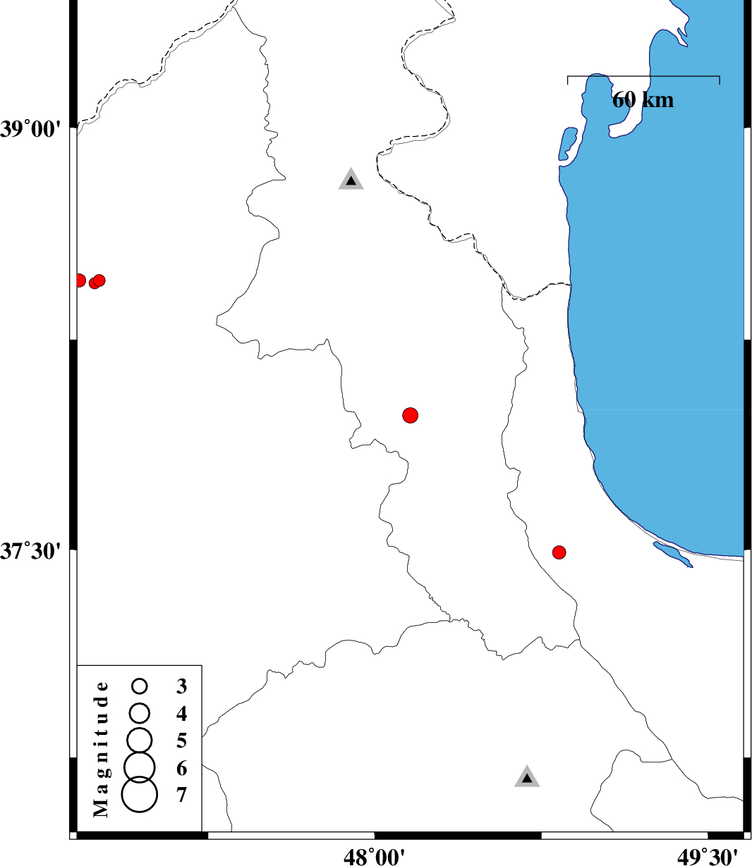 | 2012/11/04 | 17:20:04.9 | 20:50:04.9 | 37.98 | 48.16 | 14 | ML3.1 | Ardebil Province, 11 km Nir | ||