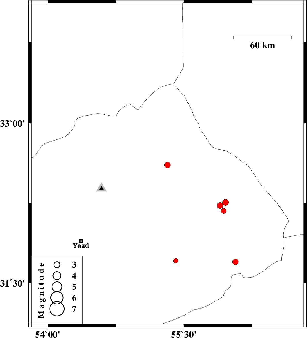 | 2012/10/30 | 10:46:31.8 | 14:16:31.8 | 31.71 | 55.41 | 14 | ML2.2 | Yazd Province, 12 km North of Bafq |