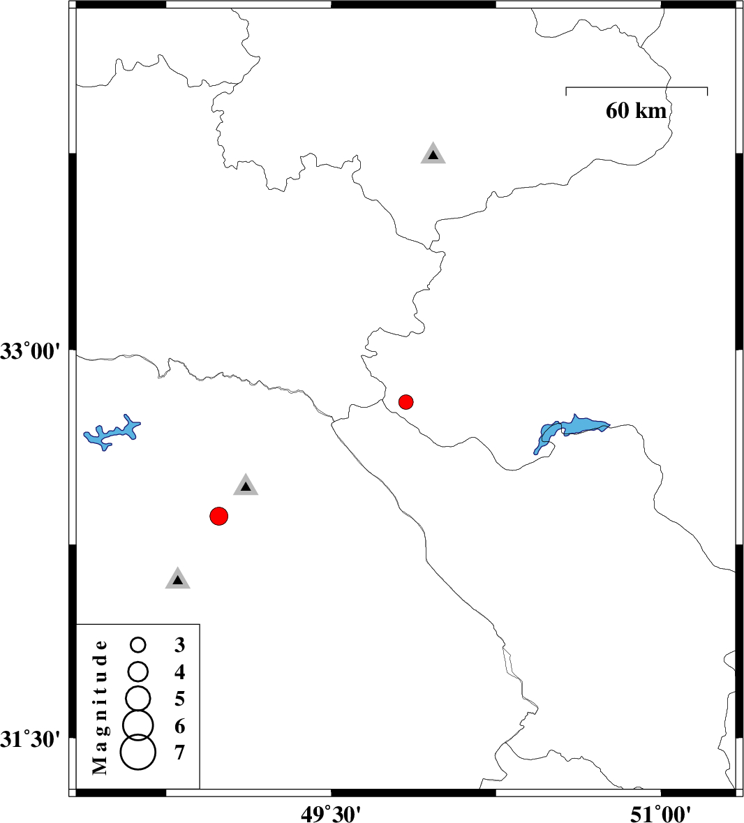 | 2012/11/06 | 00:15:22.5 | 03:45:22.5 | 32.8 | 49.84 | 6 | ML3 | Esfahan Province, 30 km South-West of Fereydunshahr | ||