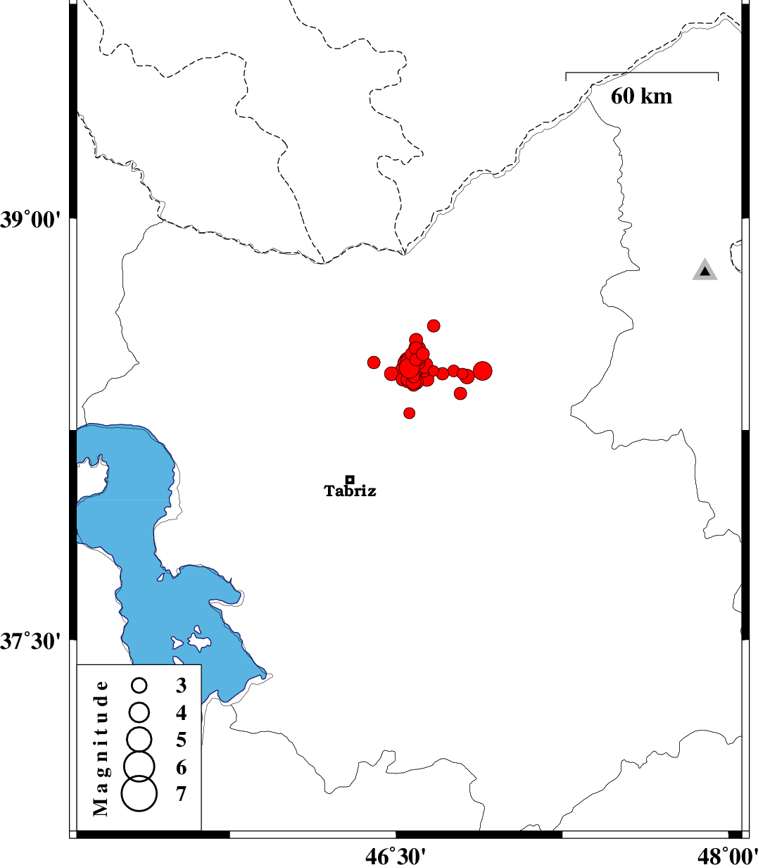 | 2012/11/07 | 06:26:30.6 | 09:56:30.6 | 38.48 | 46.57 | 14 | Ms5.6 | Azarbaijan Sharghi Province, 45 km West of Ahar | ||