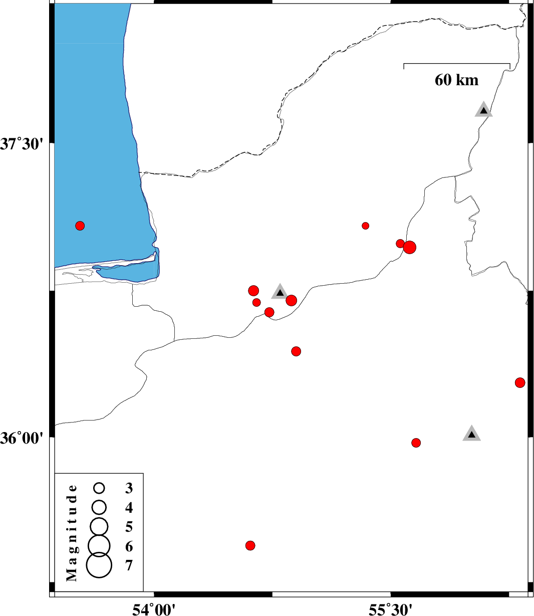 | 2012/11/12 | 08:35:05.9 | 12:05:05.9 | 36.75 | 54.63 | 14 | ML2.9 | Golestan Province, 20 km East of Gorgan | ||