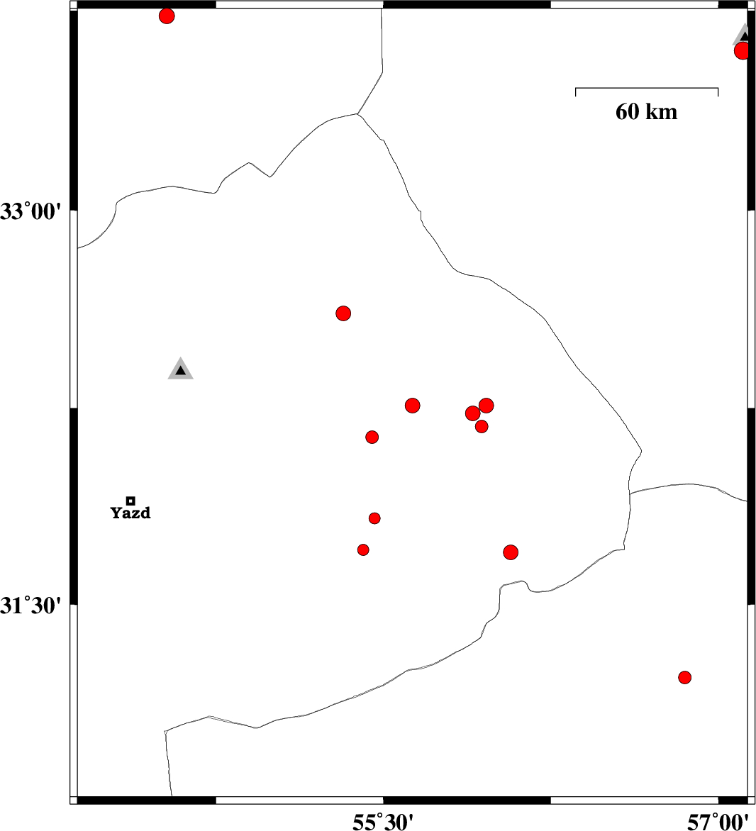 | 2012/11/01 | 14:35:26.2 | 18:05:26.2 | 32.23 | 55.9 | 18 | ML3 | Yazd Province, 84 km North-East of Bafq | ||