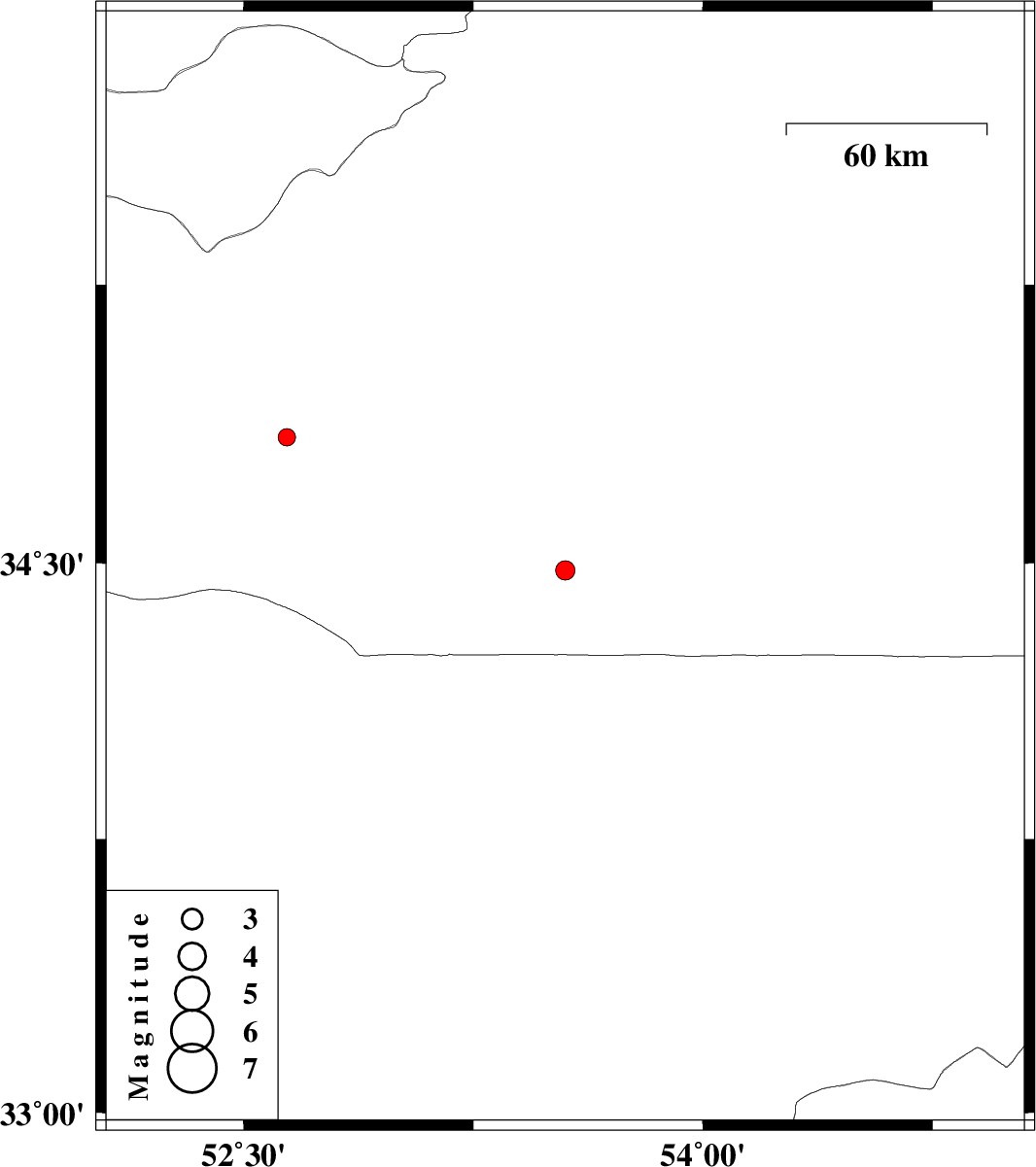 | 2012/11/11 | 16:00:44.8 | 19:30:44.8 | 34.84 | 52.64 | 17 | ML2.6 | Semnan Province, 50 km South-East of Garmsar |
